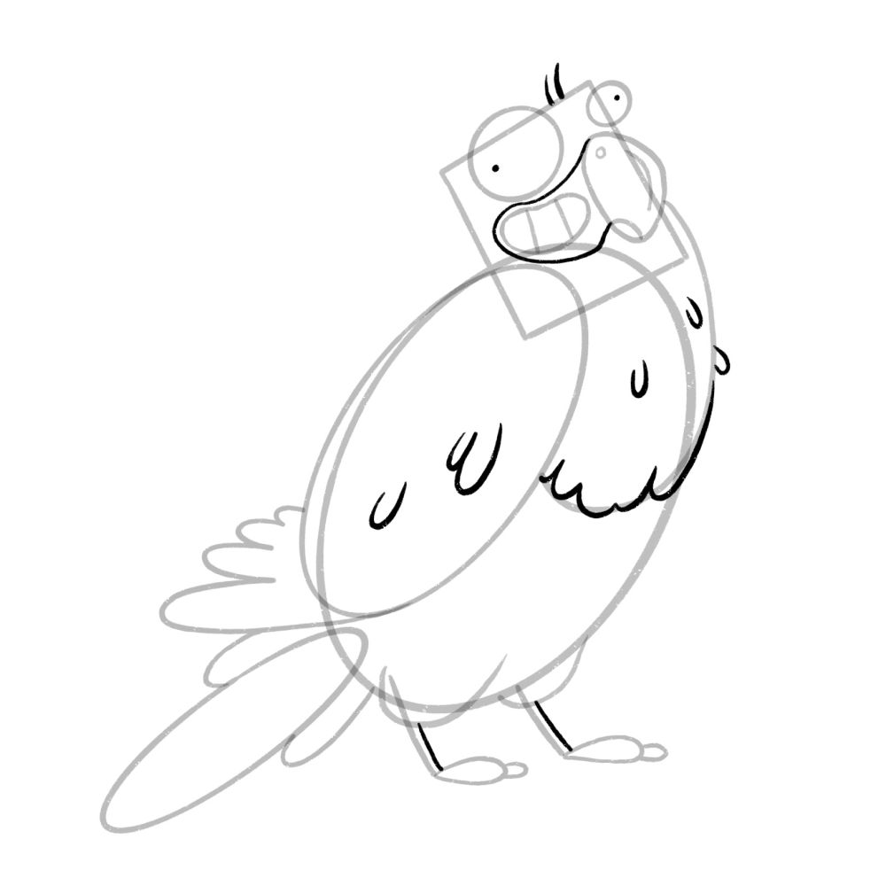 Add the final detail lines like the beak extension around the mouth, some hair on his head, and extra body feathers. Don’t forget his pupils!